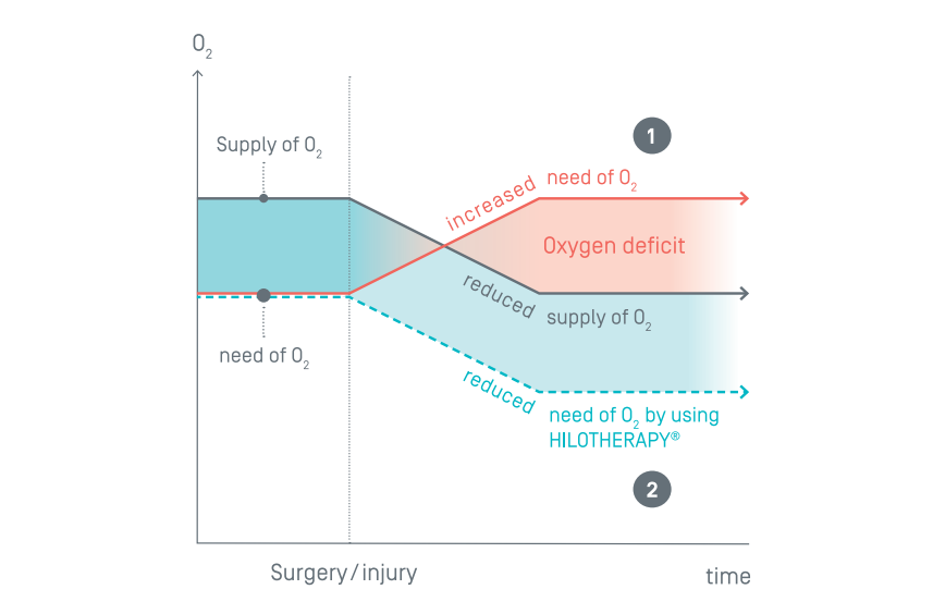 Gráfica de cómo la hiloterapia reduce la demanda postoperatoria de oxígeno en los tejidos intervenidos.